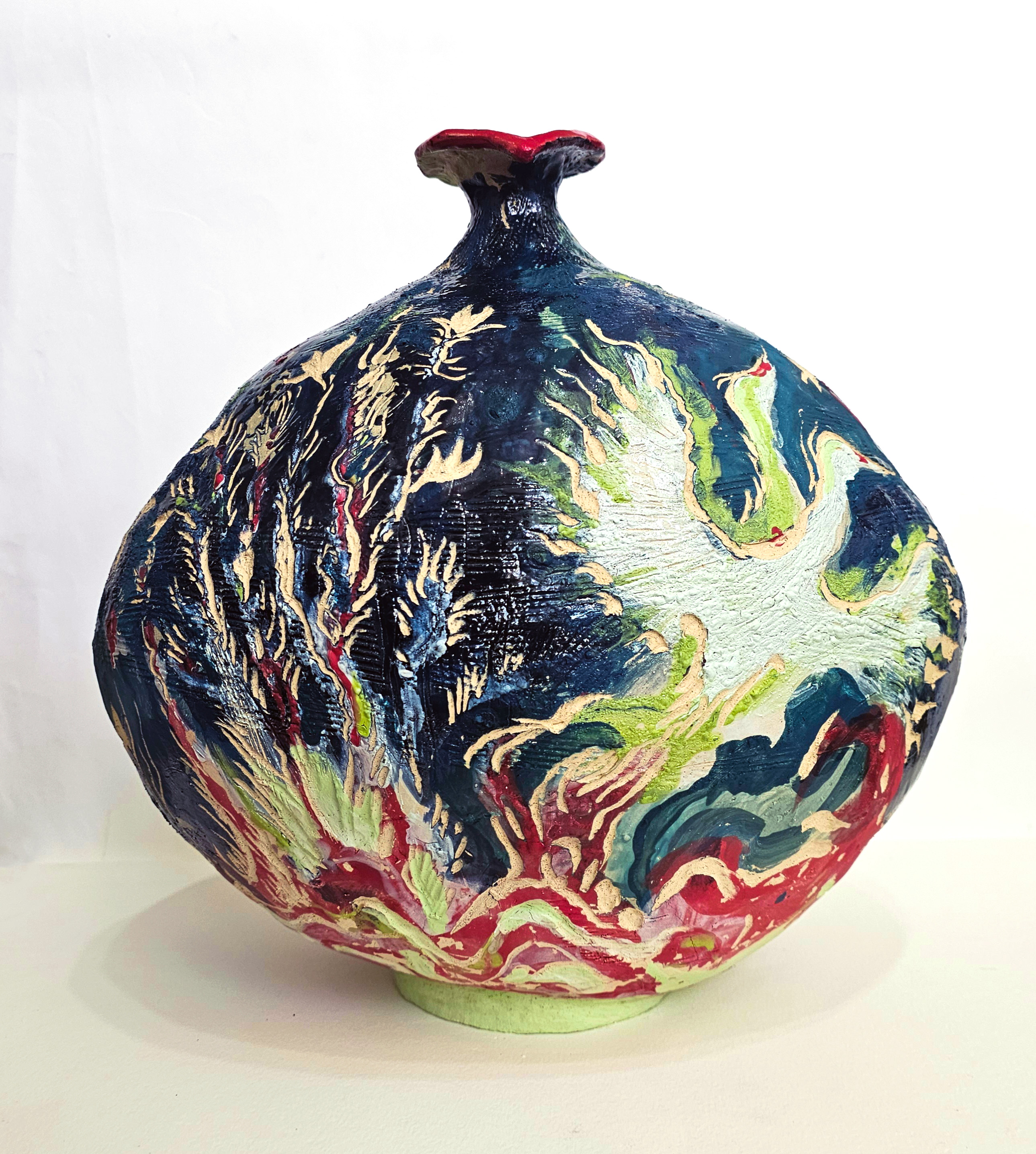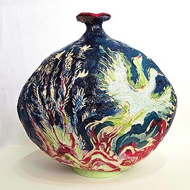 Noga Farchy constructs a sensual world of shapes, colors, and textures in her works. If Levy's close family is Israeli artists and local landscapes, Farchy's is an ancient tribe that exists in another world, which she keeps secret. Her body of work comprises jugs and clay sculptures, which she wraps in layers of drawing and burning, in a manner that remains true to her unique voice and resists the call of current trends in contemporary ceramics. Through the clay's uses, she builds an almost ritualistic relationship with the objects, creating an inner world of dream animals and imaginary remnants from a personal or mythic collection.