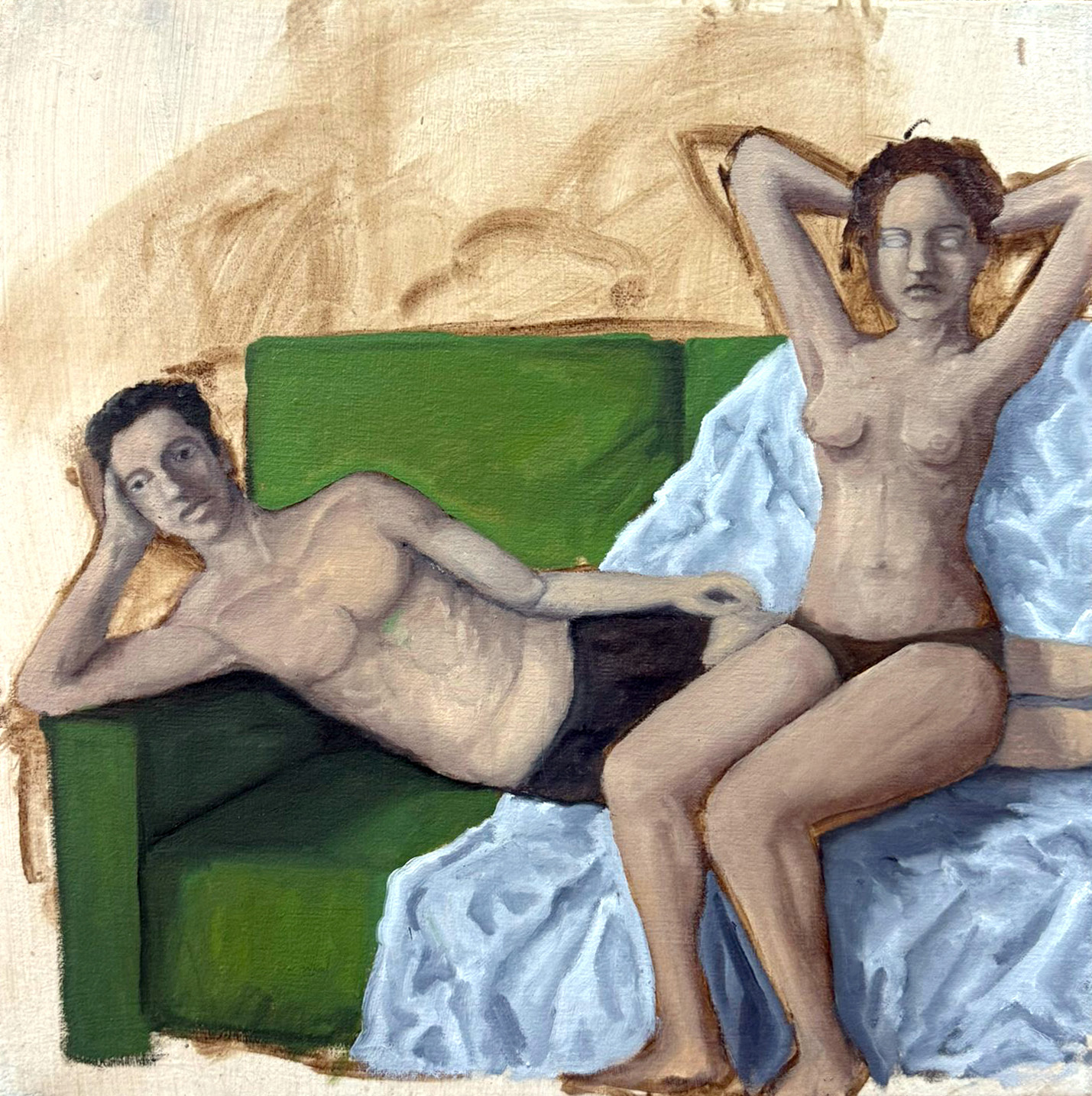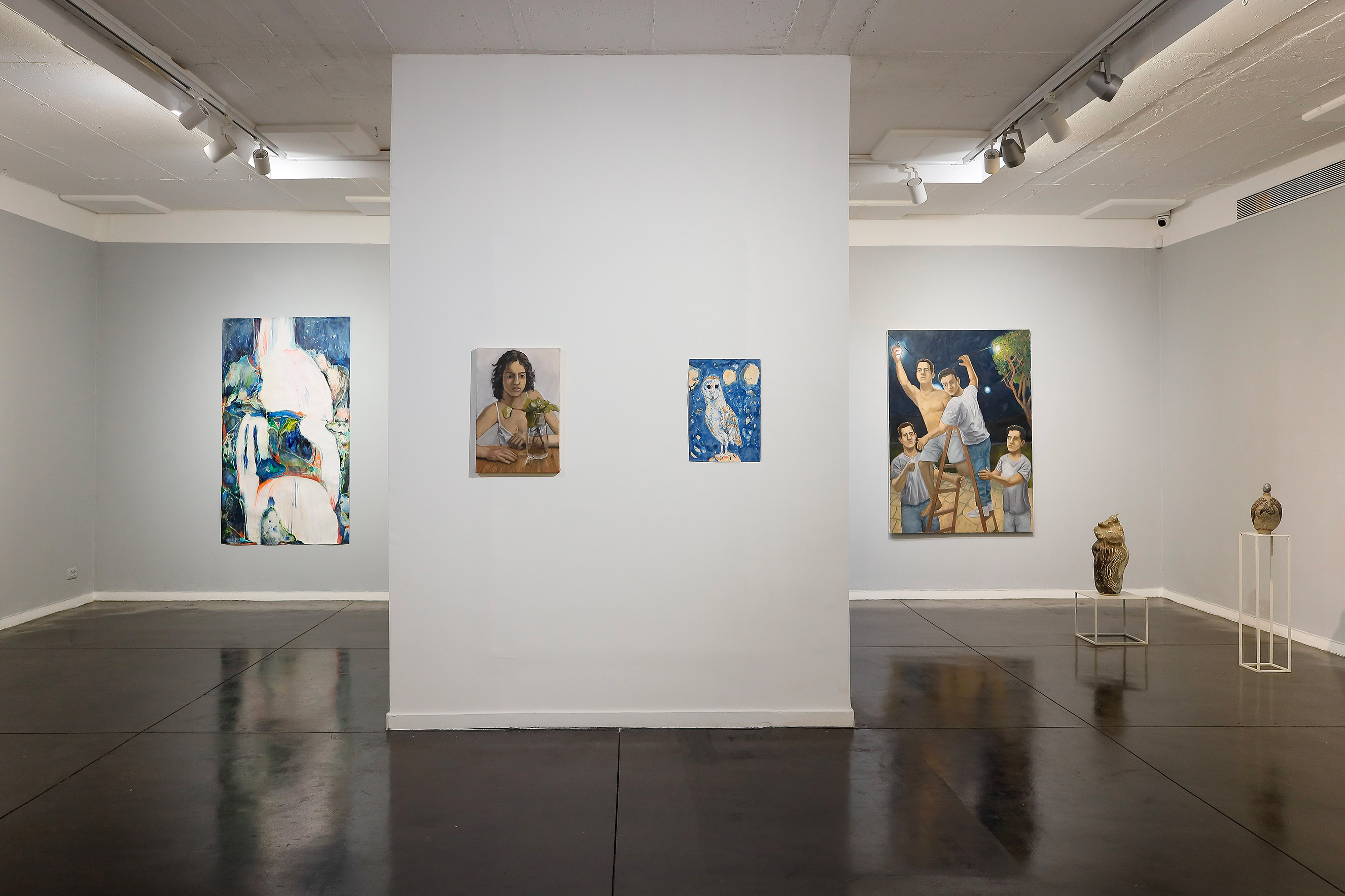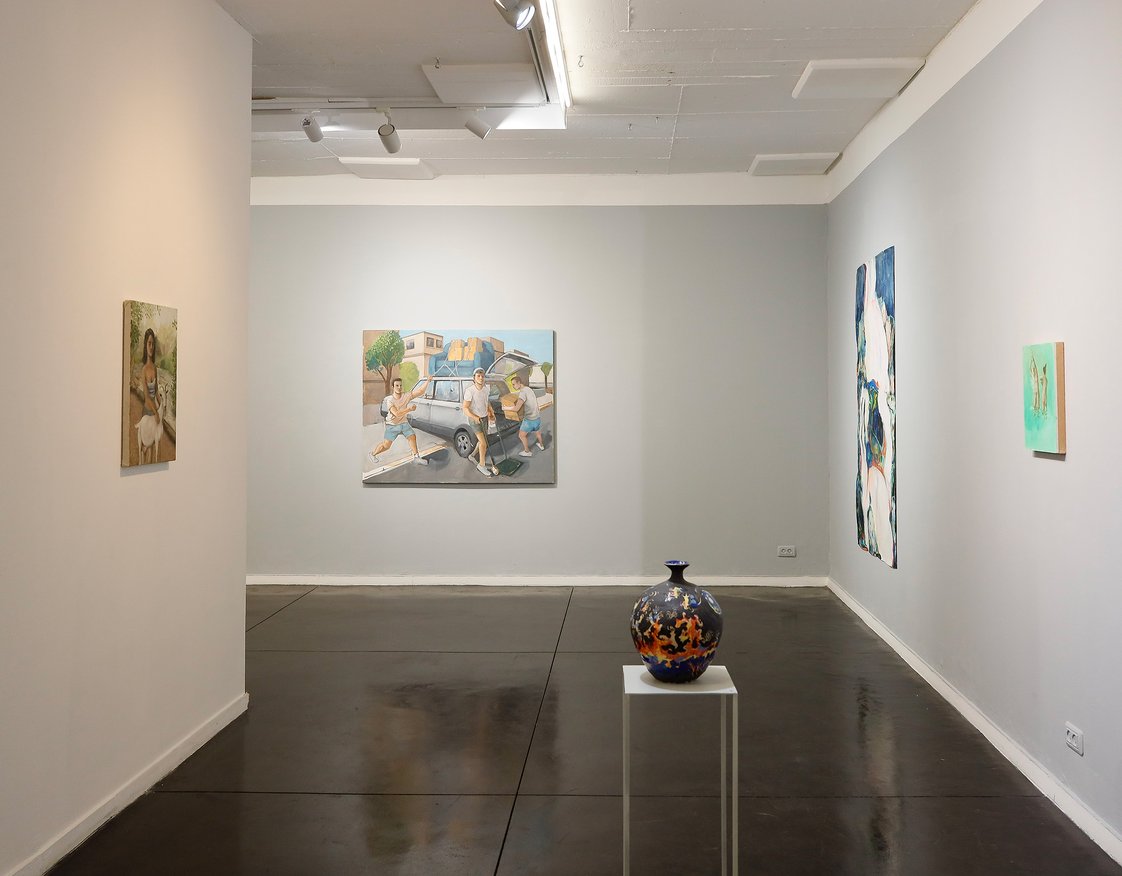 Shachaf Levy engages in figurative oil painting. His series of works follows a young couple as they take a walk, pack, or hang out together in their apartment. These quotidian scenes encompass iconic images from the Israeli canon of the 1940s: the red coffee boiler and the couple next to it are reminiscent of Gutman's "Afternoon Nap," the woman with the goat echoes Shalom Sebba's "The Shepherd," and the group of men installing lights resembles the historic photograph "The Inked Flag." These references are not consciously intended and seem to have appeared on the canvas from an uncontrollable voice of collective memory, but they also imbue the familiar episodes from Levy's life with a sense of nostalgia for a distant place that no longer exists.