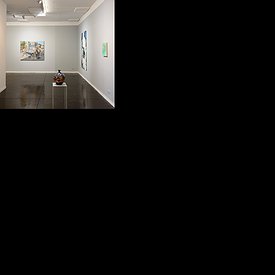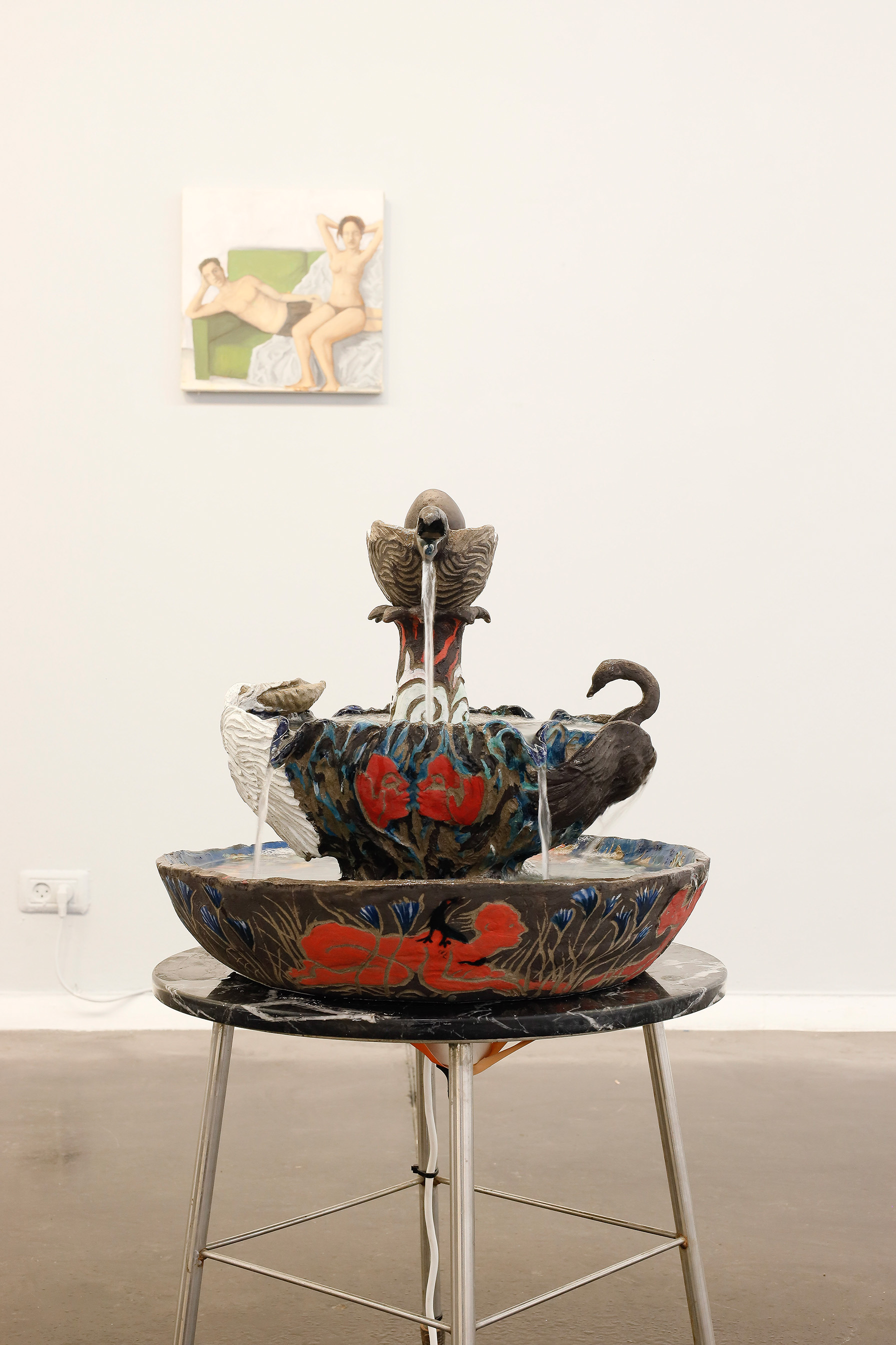 The exhibition's relationship with nature is also apparent in the unique range of colors in Levy's painting, which was previously monochromatic; the color green stands out in the boulevard's trees, in the hedges alongside a road in Thailand, in radioactive water, and in a love seat. In Farchy's jugs and drawings, the familiar colors blend into an optical flicker reminiscent of Goethe's color theory. Apparently, both artists view the world through a visual arc that is almost non-human and animal, and a clue to this can be found in the presence of many birds in the exhibition. Birds' eyes contain four color receptors, versus three in the human eye, and beyond perceiving a broader color spectrum, birds sense patterns, frequencies, and magnetic fields whose shapes we can only imagine.